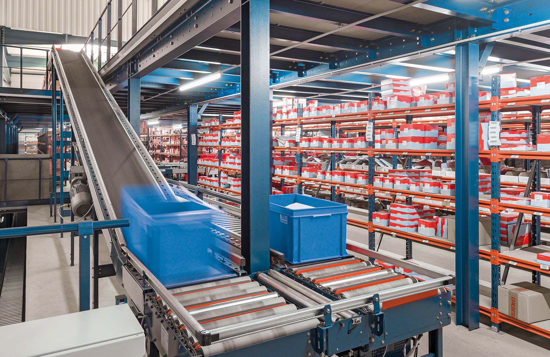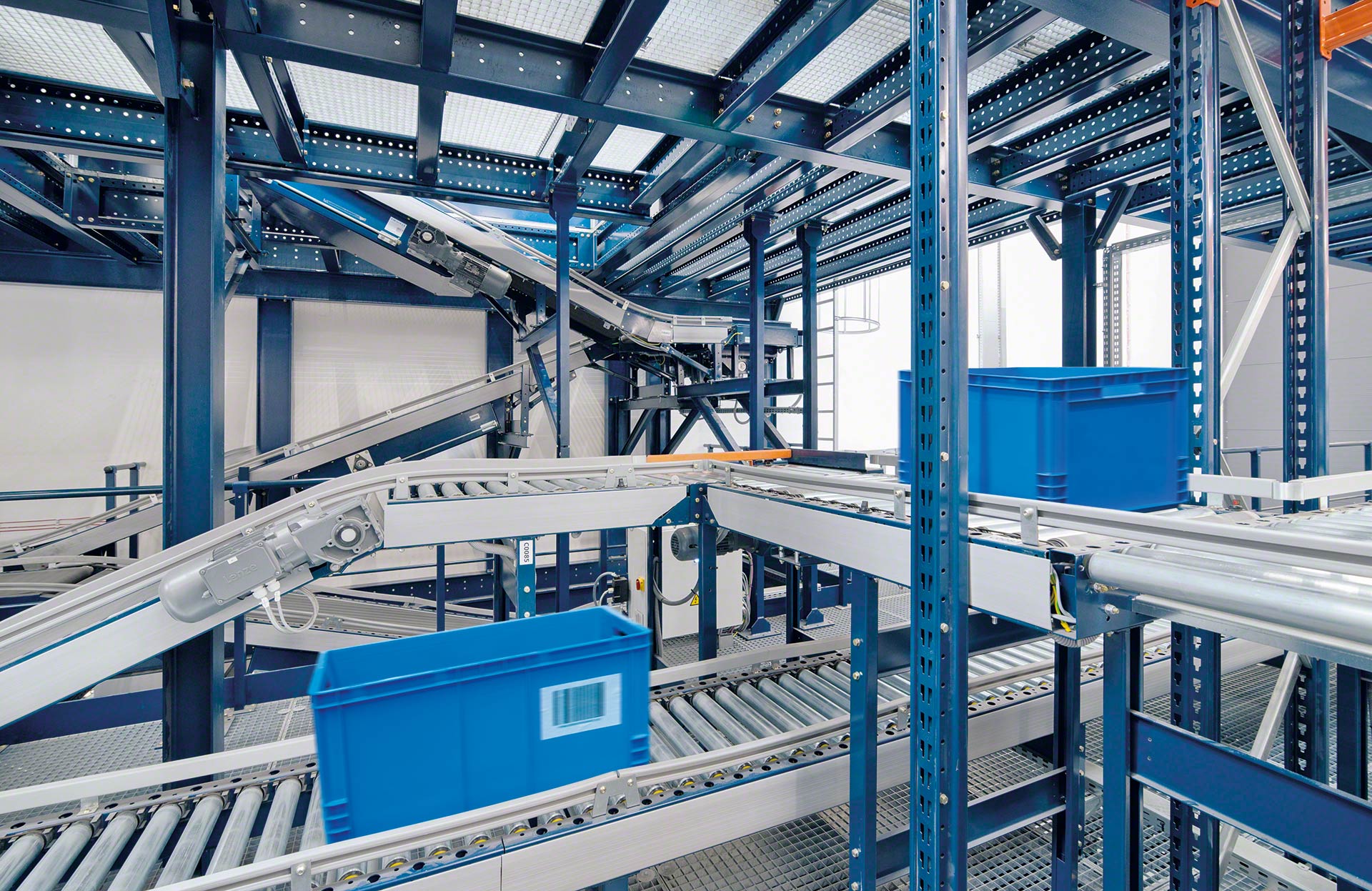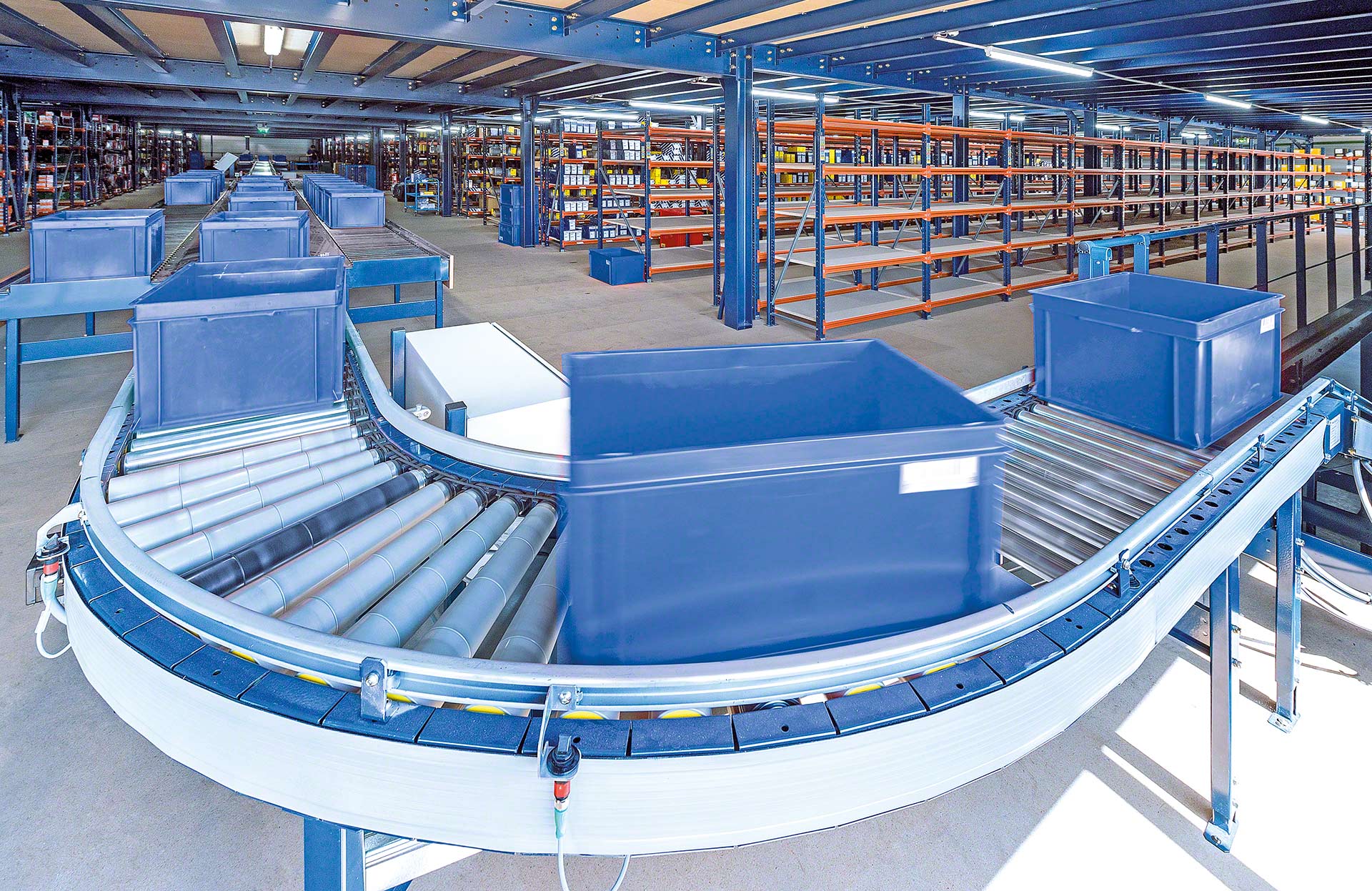 Mecalux bietet die Behälter- und Kartonfördertechnik in verschiedenen Varianten an (als Rollenförderer, Gurtförderer und Riemenausschleuser). Rollenförderer für Behälter sind Fördersysteme für Behälter, bei denen die Ladeeinheit durch einen Satz von Metallzylindern angetrieben wird, die sich auf einer Welle drehen und durch einen Motor oder durch Schwerkraft bewegt werden. Bei Gurtförderern hingegen bewegt sich die Ladeeinheit auf einer durchgehenden Fläche aus einem Gummi- oder Kunststoffband, das sich um zwei angetriebene Trommeln an den Enden der Struktur dreht. Riemenausschleuser schließlich sind Transfereinheiten, die Rollen mit senkrecht angeordneten Riemen kombinieren und dazu dienen, die Richtung oder Ausrichtung der geförderten Ladeeinheit zu ändern.