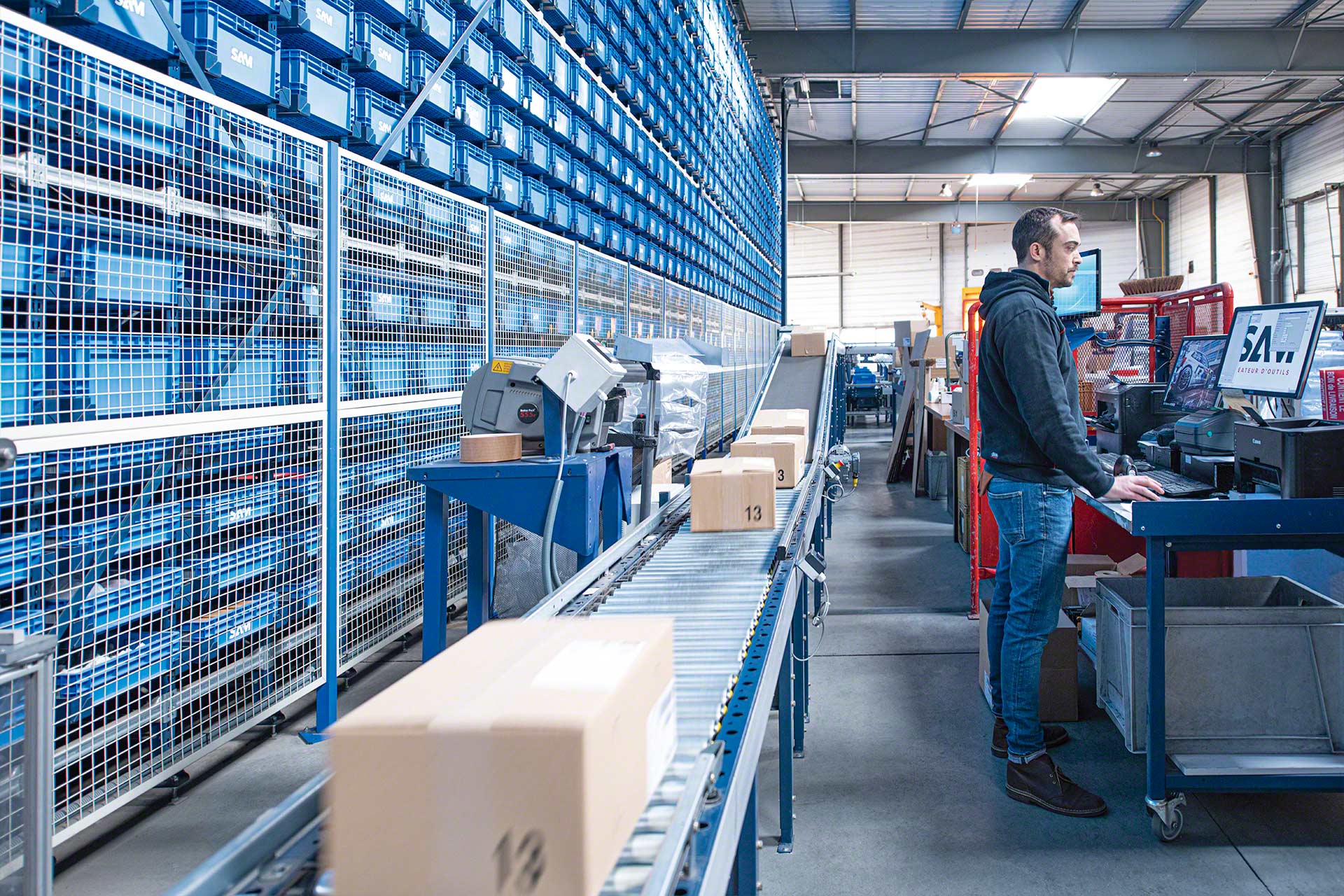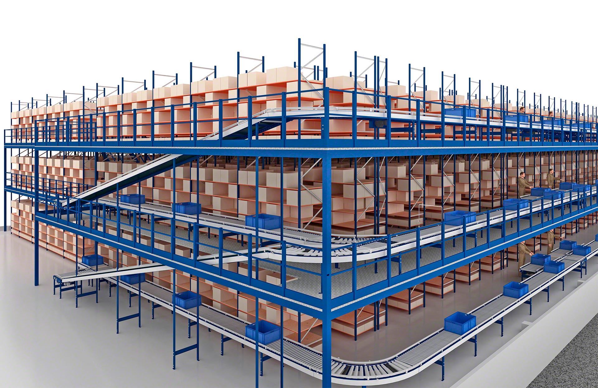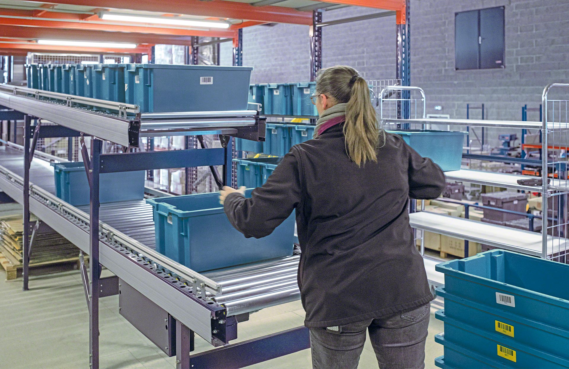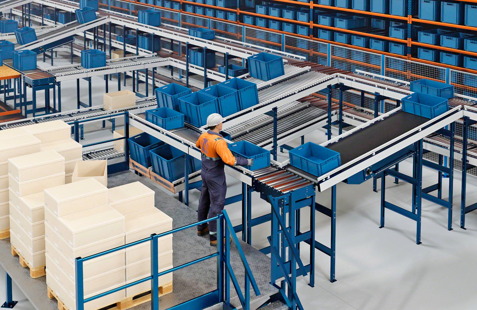 Mecalux bietet die Behälter- und Kartonfördertechnik in verschiedenen Varianten an (als Rollenförderer, Gurtförderer und Riemenausschleuser). Rollenförderer für Behälter sind Fördersysteme für Behälter, bei denen die Ladeeinheit durch einen Satz von Metallzylindern angetrieben wird, die sich auf einer Welle drehen und durch einen Motor oder durch Schwerkraft bewegt werden. Bei Gurtförderern hingegen bewegt sich die Ladeeinheit auf einer durchgehenden Fläche aus einem Gummi- oder Kunststoffband, das sich um zwei angetriebene Trommeln an den Enden der Struktur dreht. Riemenausschleuser schließlich sind Transfereinheiten, die Rollen mit senkrecht angeordneten Riemen kombinieren und dazu dienen, die Richtung oder Ausrichtung der geförderten Ladeeinheit zu ändern.