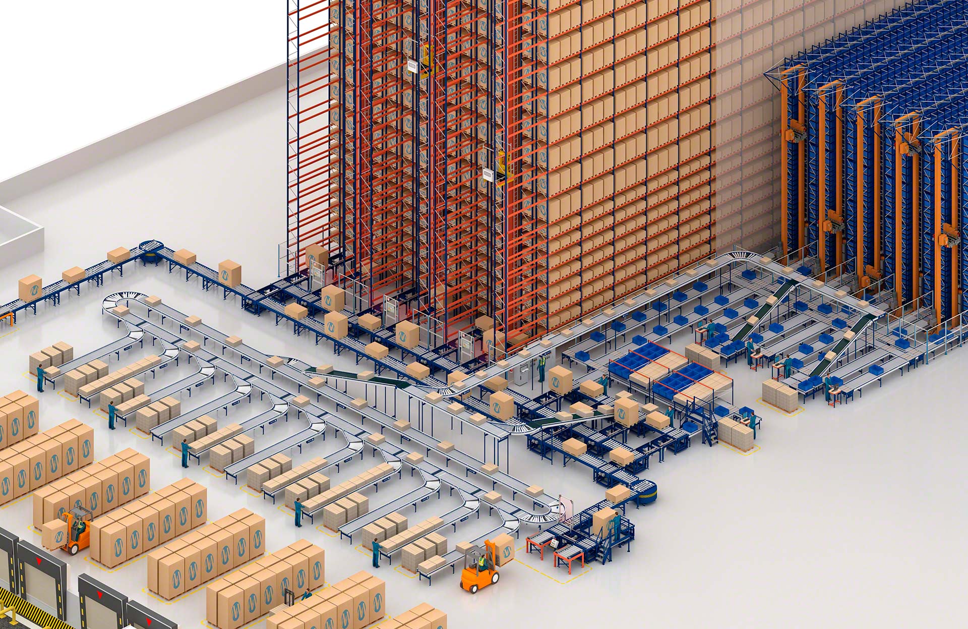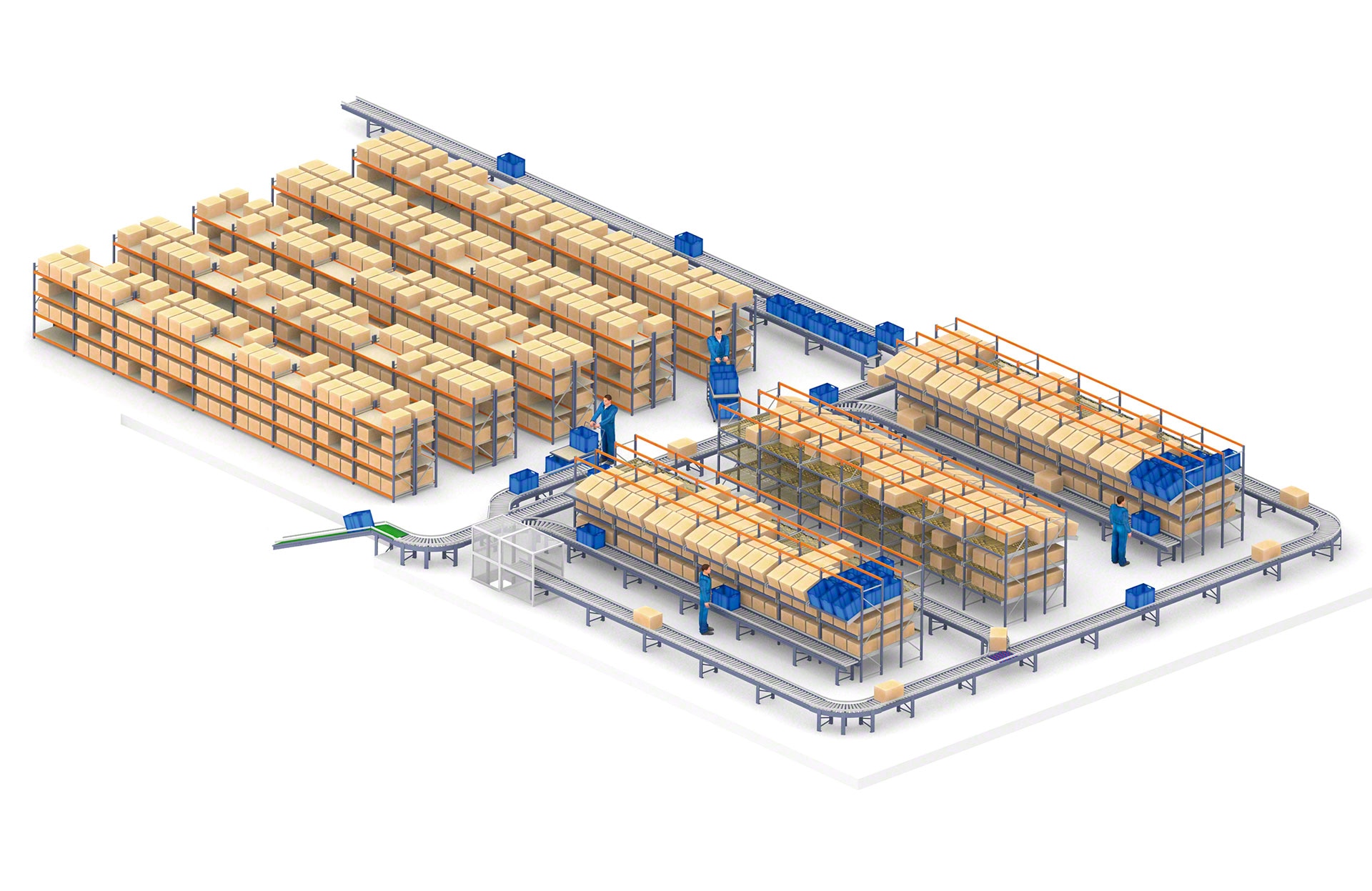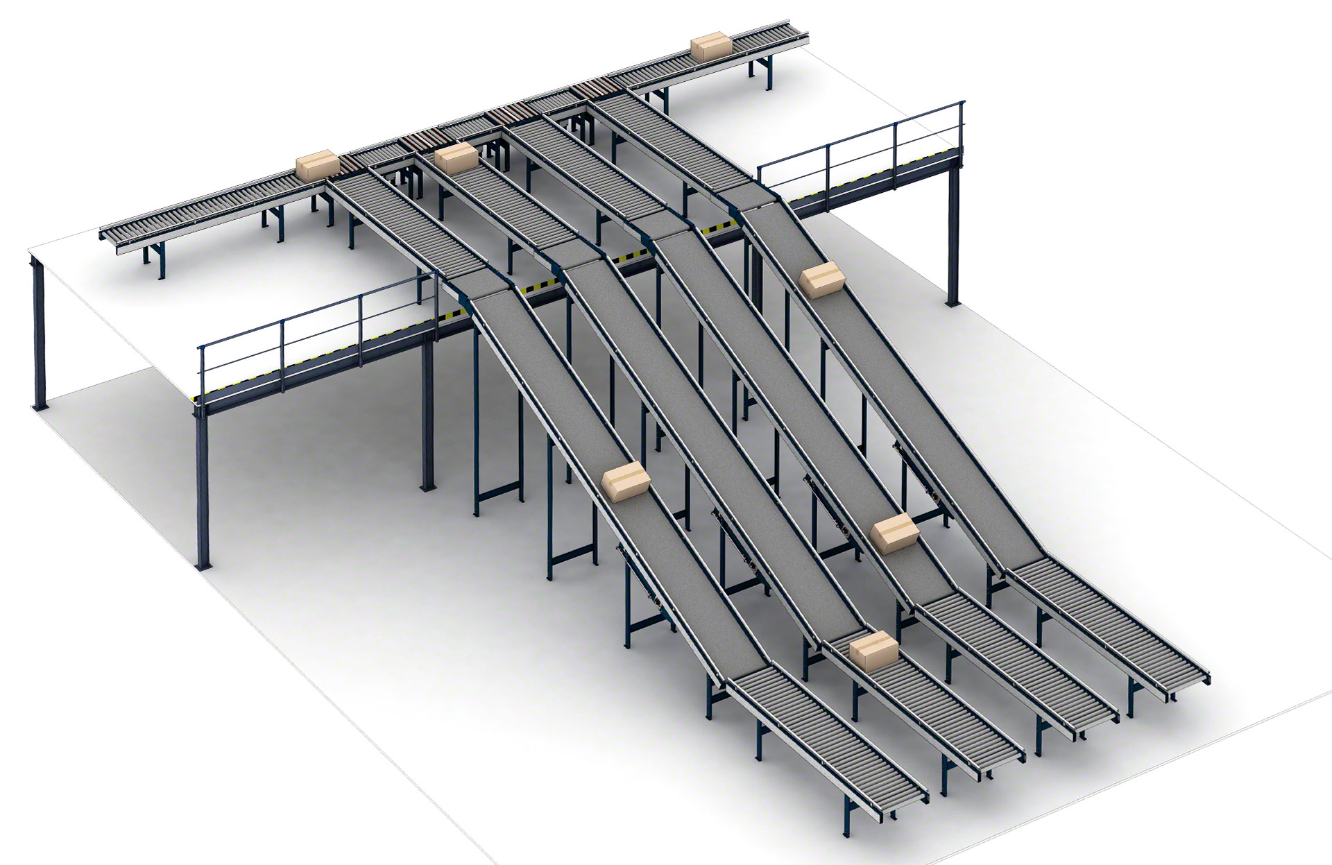 Dank der großen Auswahl an Mecalux-Förderern ist es möglich, alle Arten von Strecken zusammenzustellen, von einfachen Fördersystemen mit geraden Abschnitten und einem Ausgangs- und einem Zielpunkt bis hin zu komplexen Fördersystemen mit mehreren Ausgangs- und Zielpunkten. Diese Vielseitigkeit gewährleistet, dass das System an unterschiedliche spezifische Anforderungen angepasst werden kann. Mit Kurvenrollenförderern können beispielsweise Hindernisse umfahren werden, und Transferförderer ändern die Richtung und Ausrichtung, in der sich Ladeeinheiten bewegen.
