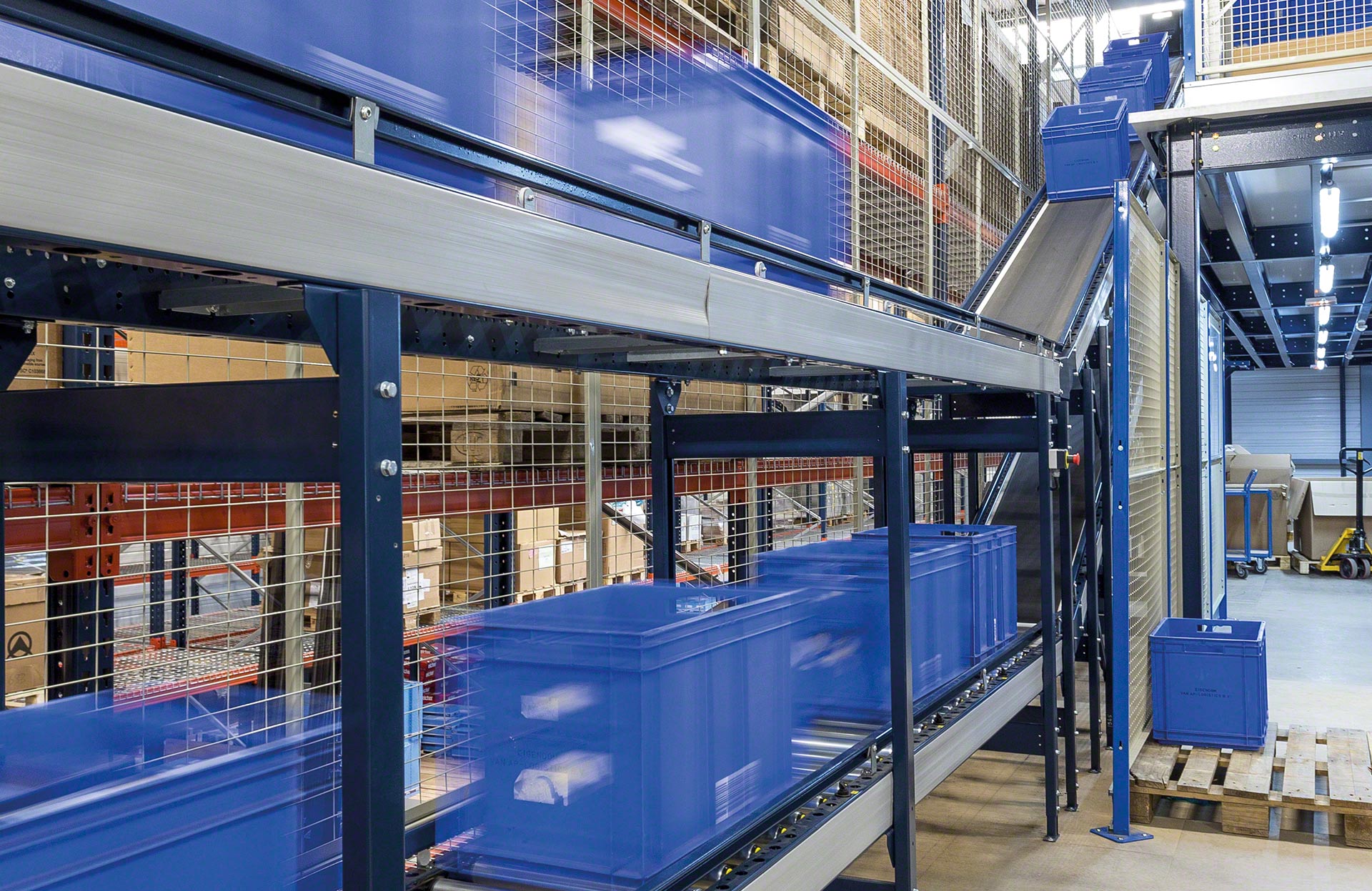 Die Behälter- und Kartonfördertechnik minimiert den Warenumschlag, den Durchgang von Bedienern sowie den Verkehr von Flurfördermitteln. Dies steigert die Produktivität während gleichzeitig Fehler und Betriebskosten reduziert werden.