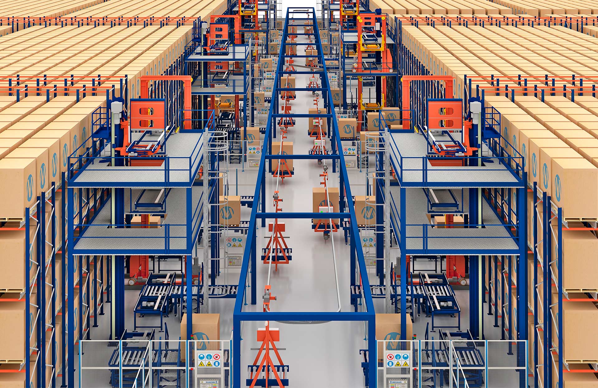 Elektropalettenbahnen von Mecalux verfügen über eine Reihe von Sicherheitsvorrichtungen und -mechanismen. Diese verhindern Kollisionen der Fahrzeuge und gewährleisten den reibungslosen Ablauf entlang des Streckensystems.