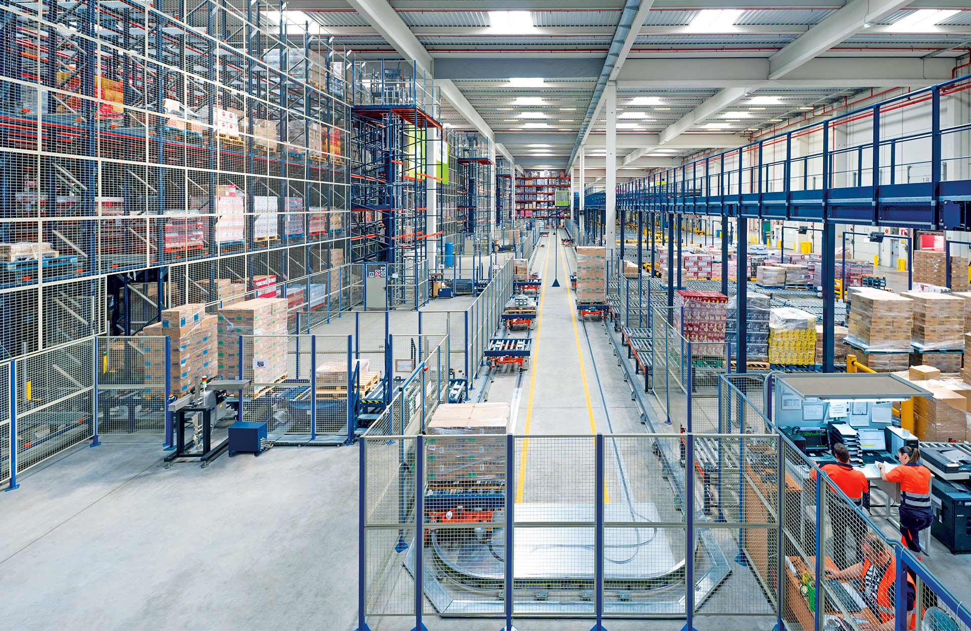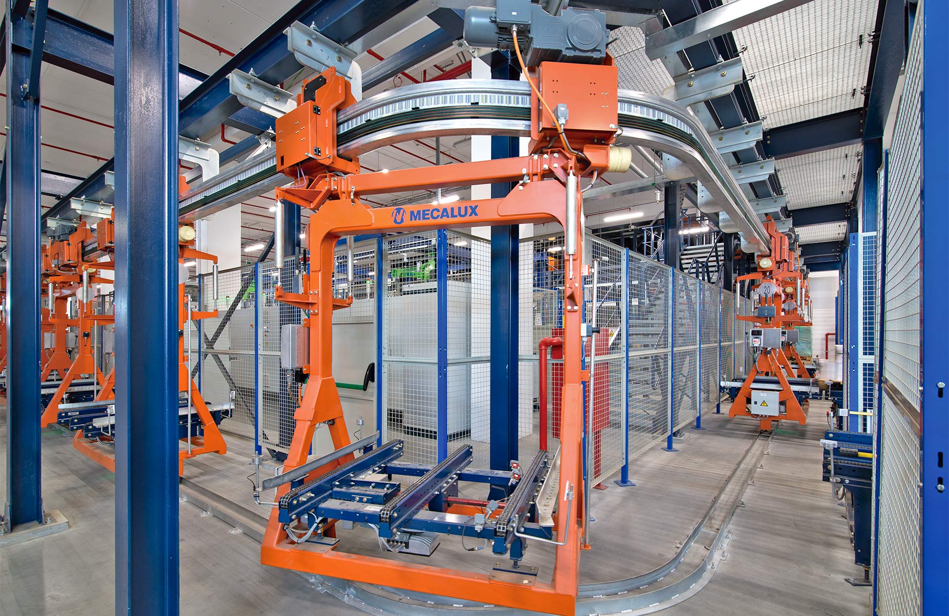 Die Transportmittel werden von einer Software geführt, die den Verkehr regelt und ihnen die geeignetste Route zuweist. Sie bewegen sich entlang des Fördersystems, um Paletten zwischen verschiedenen Be- und Entladestellen zu transportieren. Dank ihrer Geschwindigkeit tragen die Elektropalettenbahnen zu einer maximalen Rationalisierung des Warenflusses in allen Lagern und Produktionszentren bei.