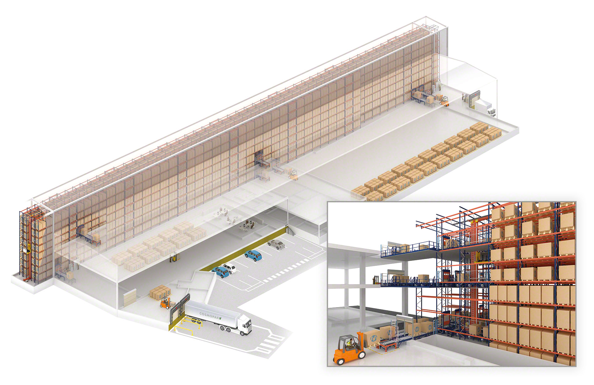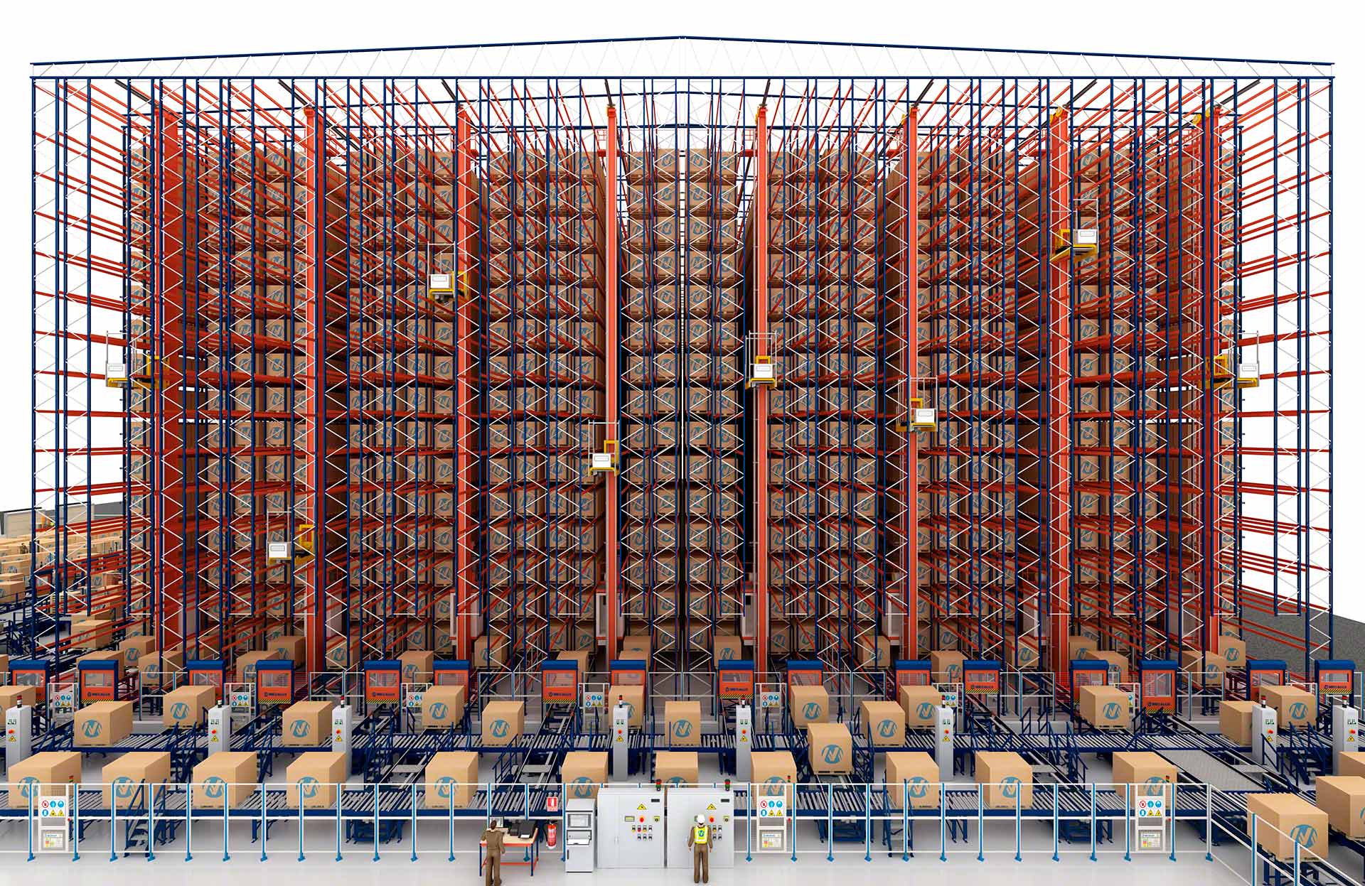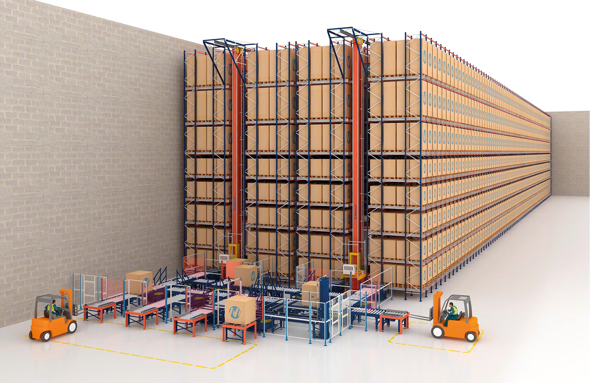 - Umfassende Lösung: Mecalux gewährleistet den Entwurf, die Herstellung, Installation und Inbetriebnahme aller Komponenten des automatischen Lagers, von den Regalen, Regalbediengeräten und Fördersystemen bis zur Steuerungs- und Lagerverwaltungssoftware.