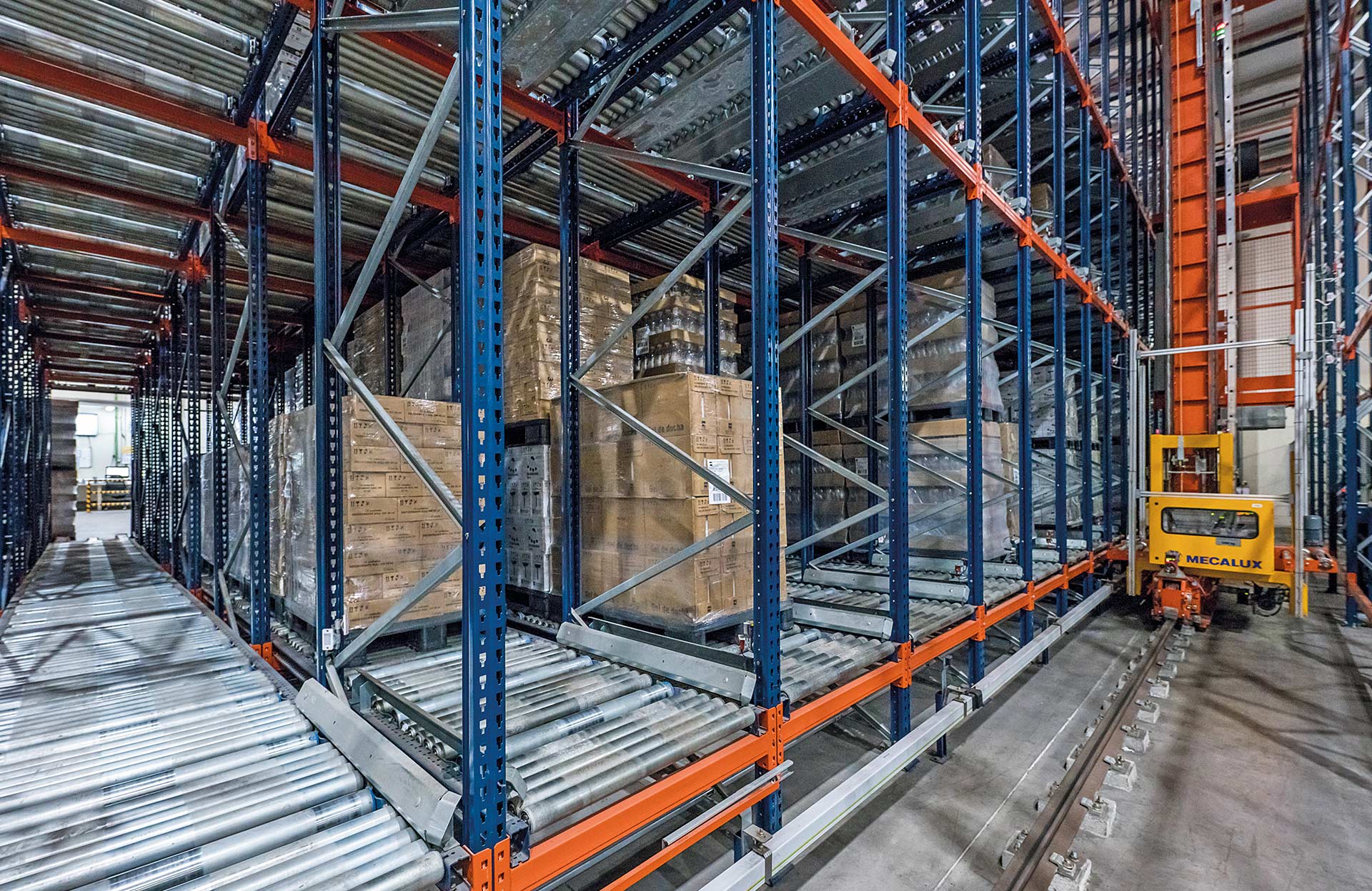 Die Regalbediengeräte von Mecalux können mit Regalen einfacher oder doppelter Tiefe, Durchlaufregalen oder mit dem automatischen Pallet-Shuttle-System eingesetzt werden.