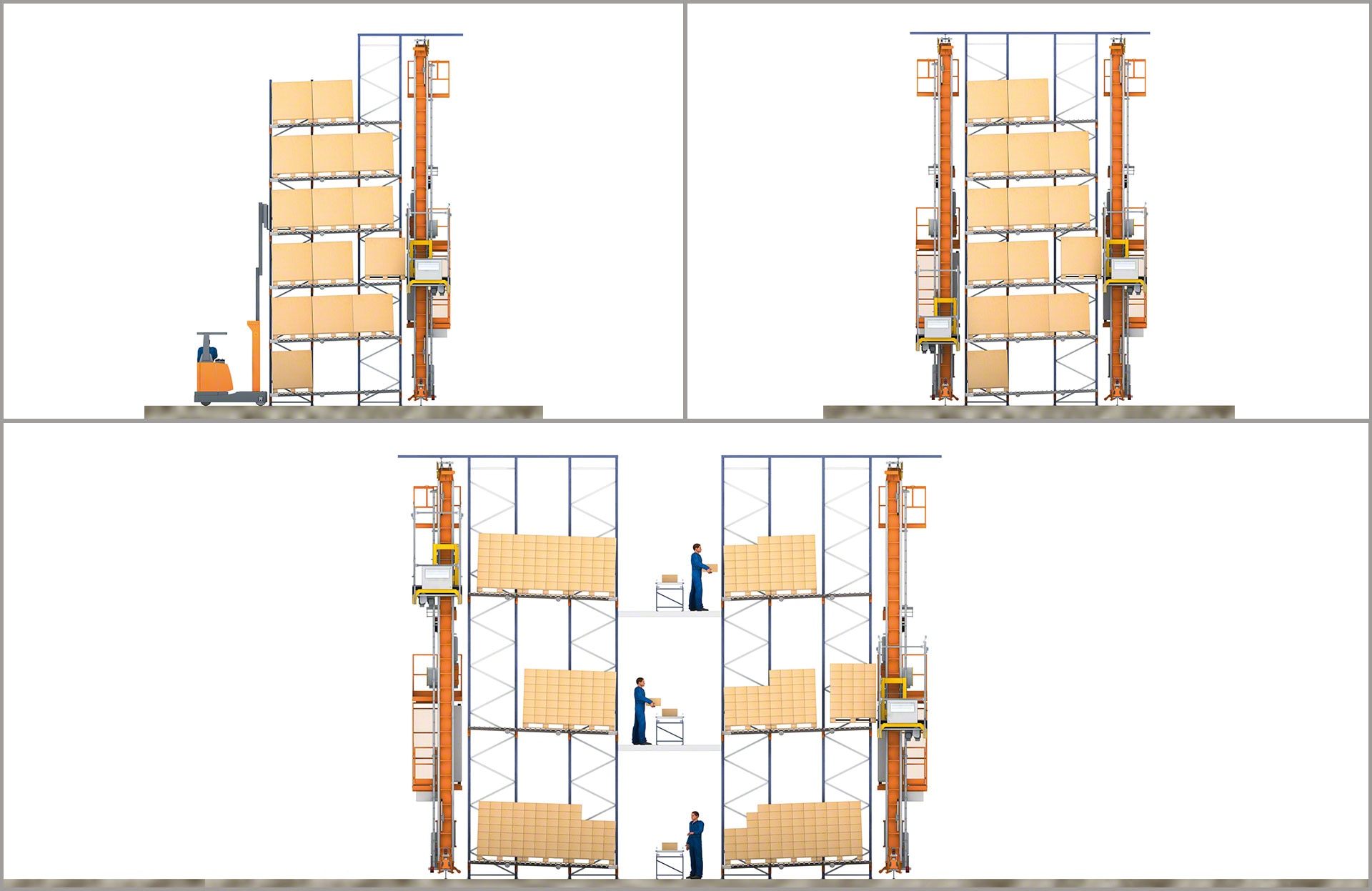 Das verwendete Lastaufnahmemittel variiert je nach Verwendung, umzuschlagender Last, Anordnung der Regale und sogar je nach Ablauf. Im Prinzip gibt es drei Typen: Teleskopgabel (einfacher und doppelter Tiefe), Pallet Shuttle und integriertes Fördersystem.