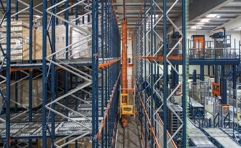 Im Inneren des Lagers wurden drei Gänge mit einer Länge von 70 m eingerichtet, durch die ein Zweimast-Regalbediengerät MT3 fährt. Jedes Regalbediengerät kann pro Stunde bis zu 24 kombinierte simultane Zyklen ausführen und verfügt über ein Shuttle, das die Palette bis zu der freien Position im Gang transportiert, die von der Lagerverwaltungssoftware Easy WMS angegeben wird.