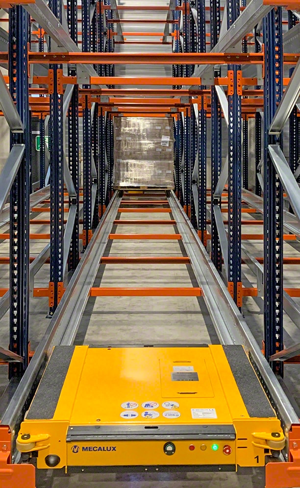 Mecalux hat einen 29 m langen und 8 m hohen Regalblock mit dem halbautomatisierten Pallet-Shuttle-System installiert. Der Regalblock nimmt eine Fläche von nur 350 m² ein und kann bis zu 1.120 Paletten lagern.