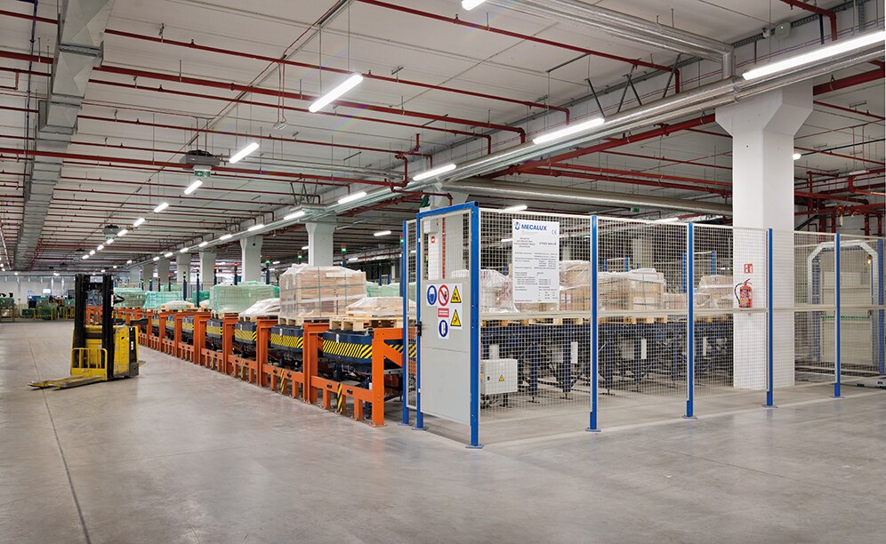 Ein doppelter Verfahrwagen transportiert die Paletten mit der Ladung und klassifiziert sie in zwölf Ladevorbereitungskanälen. Diese bestehen aus Kettenförderern und einem Drehtisch an den Enden, der es ermöglicht, die Paletten von der jeweils praktischeren Seite aufzunehmen, abhängig von ihrer Anordnung im Transportfahrzeug. Mithilfe dieses Systems lassen sich die Paletten eines Auftrags oder einer Versandroute gruppieren und der Vorgang der Beladung der Versandfahrzeuge beschleunigen.