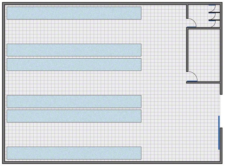 Lager mit einer einfachen Konfigurierung bestehend aus Lagerbereich, Verwaltungsbereich, Umkleide und Toiletten.