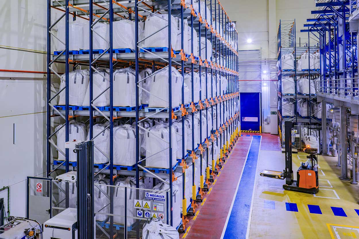 Im Lager von Herba Ricemills werden ebenfalls Regale verwendet, die mit dem halbautomatischen Pallet Shuttle ausgestattet sind und sich ideal für die Arbeit mit sehr hohen Mengen an Paletten desselben Artikels eignen.