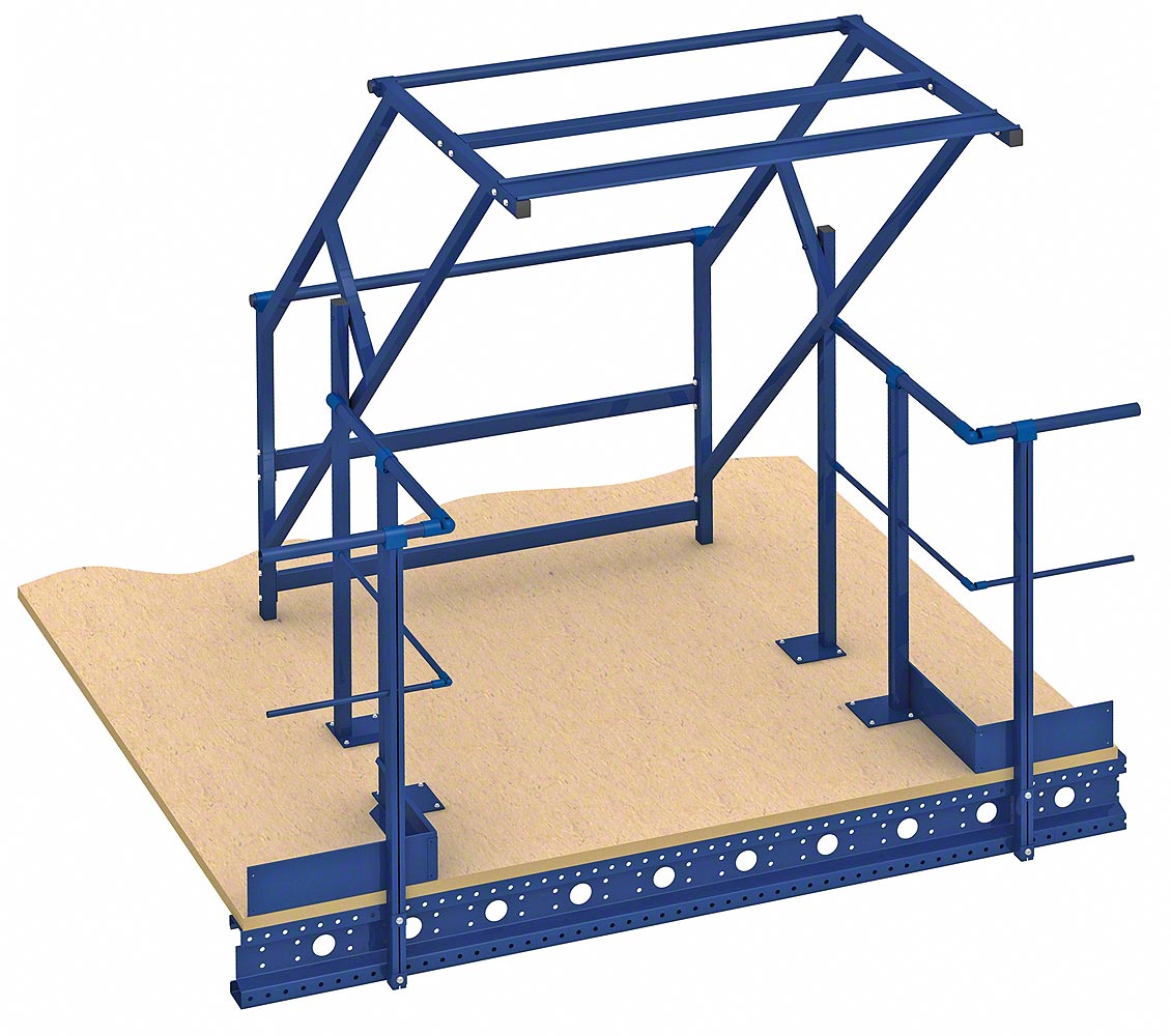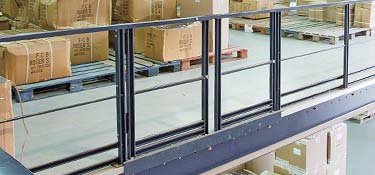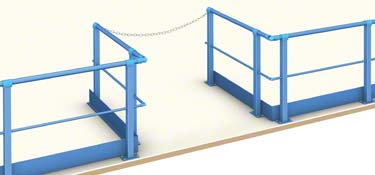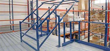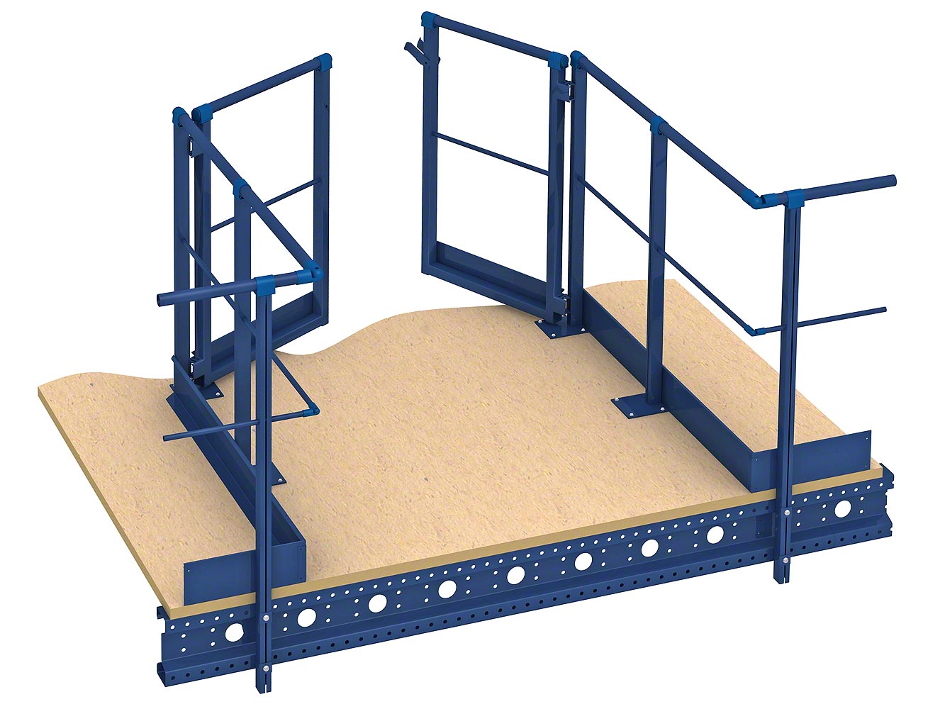 Der gesamte äußere Rand von Lagerbühnen, der nicht an Wände angrenzt, muss mit Geländern versehen werden, die als Schutzvorrichtung und Sicherheitselemente für die Mitarbeiter dienen. Bei manchen Lagerbühnen kann es notwendig sein, einen Bereich für das Be- und Entladen von Paletten einzurichten. Dazu werden Öffnungen im Geländer geschaffen, die je nach Anforderung mit verschiedenen Arten von Türen gesichert werden können: Flügeltüren, Schiebetüren, Kipptüren oder einfache Sicherheitsketten.