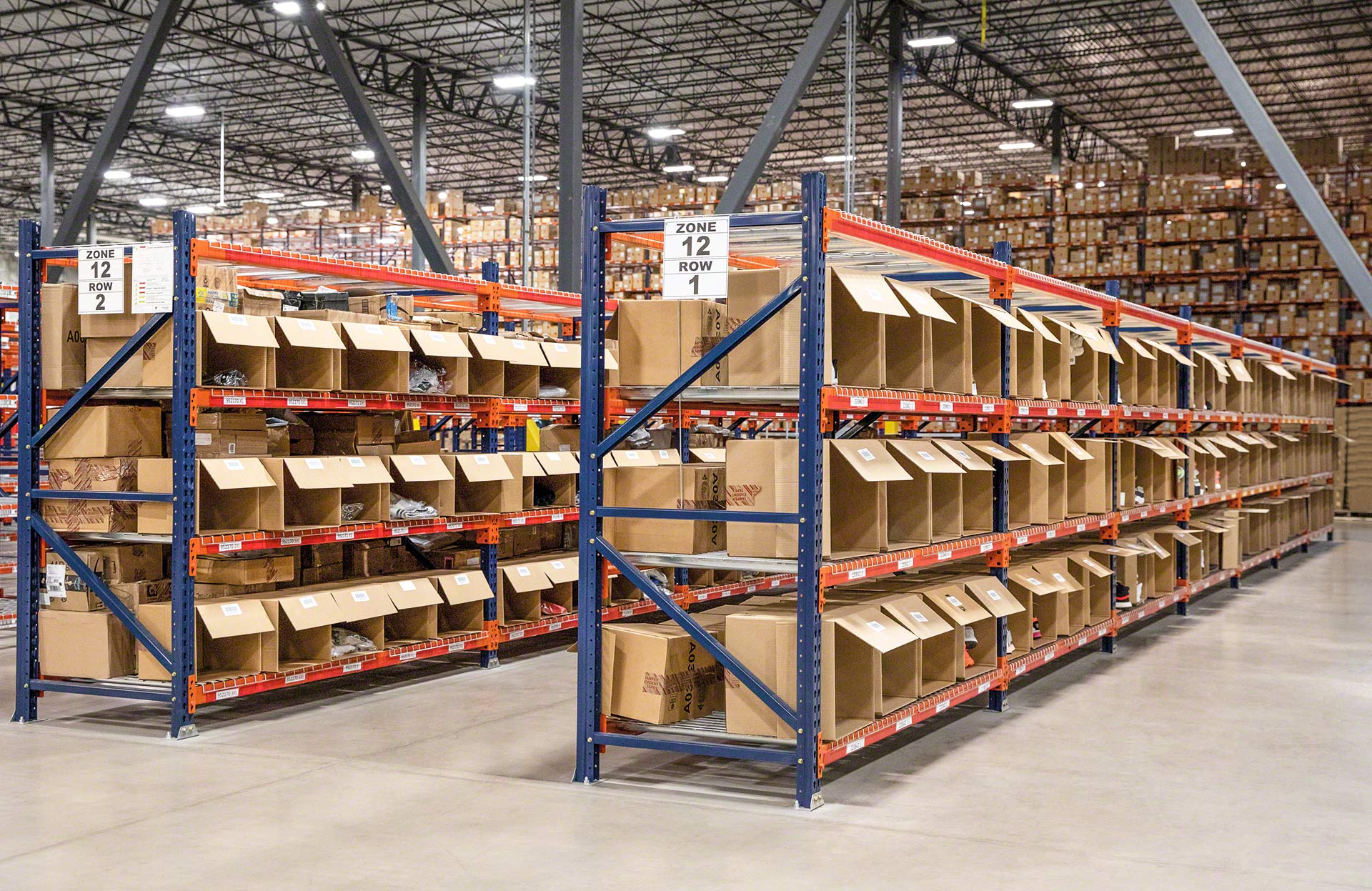 Mecalux M7Weitspannregale für mittlere und schwere Lasten M7 werden häufig in Kommissionierlagern eingesetzt und tragen Gewichte von mehr als 1.000 kg pro Ebene.
