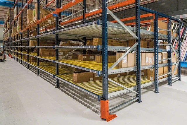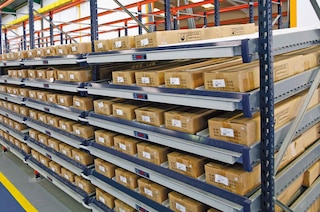 Schwerkraftgesteuertes Lagersystem für leichte Lasten, das die Zeit für die Auftragszusammenstellung verkürzt und eine perfekte Rotation der gelagerten Waren ermöglicht.